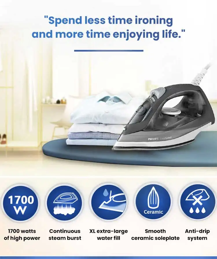 ⚡ 1700 W de performance : chauffe ultra-rapide en 30 secondes pour un repassage prêt à l’emploi sans attendre.